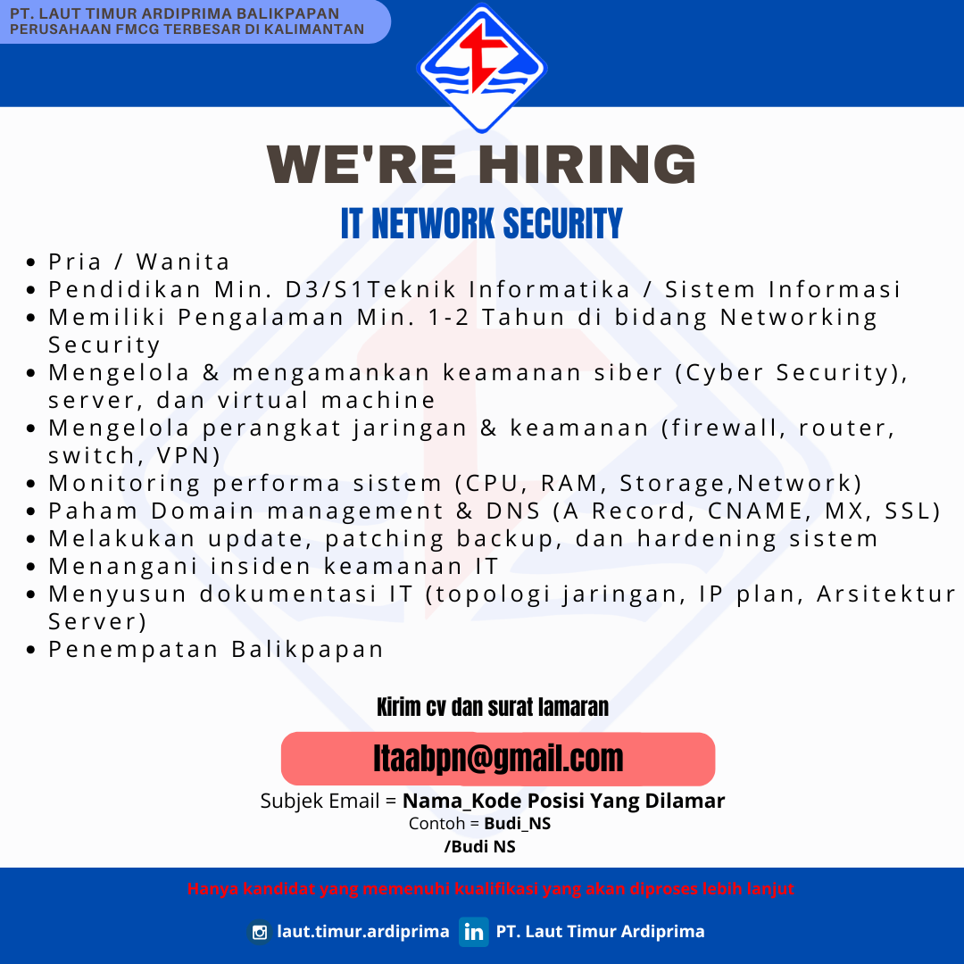 - Memiliki Pengalaman Min. 1-2 Tahun di bidang Networking Security.